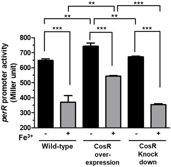 Based on the role of CosR and PerR in the regulation of oxidative stress defense, we hypothesized that the two regulators may influence their transcription to coordinate the transcriptional regulation of oxidative stress defense. To examine this hypothesis, we measured whether CosR might affect perR transcription. Due to the essentiality of CosR in the viability of C. jejuni, a knockout mutant of cosR could not be constructed in multiple studies [,,]. Thus, we measured the level of perR transcription under the conditions of CosR overexpression and CosR knockdown which were established in our previous studies [,]. Interestingly, the results of the PperR-lacZ fusion assay showed that the level of perR transcription was increased when CosR was overexpressed (Figure 4). However, CosR knockdown by antisense PNA did not affect perR transcription significantly (Figure 4). Although the level of perR transcription was increased by CosR overexpression in the presence and absence of iron, the overall level of perR transcription was reduced by iron regardless of the levels of CosR in wild-type, a CosR-overexpression strain, and CosR-knockdown conditions (Figure 4), suggesting that CosR regulation of perR transcription is independent of iron.