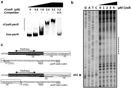 Since CosR positively affected perR transcription (Figure 4), we examined whether CosR regulation of perR transcription is mediated by direct interaction between CosR and the perR promoter. The binding of CosR to the perR promoter was examined with EMSA, which showed that CosR was directly bound to the perR promoter (Figure 5a). Previously, we reported that the transcription of perR is driven by two promoters, and PerR regulates its transcription by autoregulation []. By performing a DNase I footprinting assay, we identified the CosR binding site in the −10 and −35 region of the two perR promoters (Figure 5b), and a part of the 5′ region of the CosR binding site that overlapped with the PerR box to which PerR binds for autoregulation (Figure 5c). These results indicate that CosR regulates perR transcription by directly binding to the perR promoter.