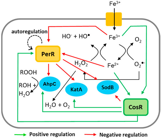Schematic diagram of oxidative stress defense regulation by CosR and PerR. Positive and negative regulations are indicated with green and red lines, respectively.
