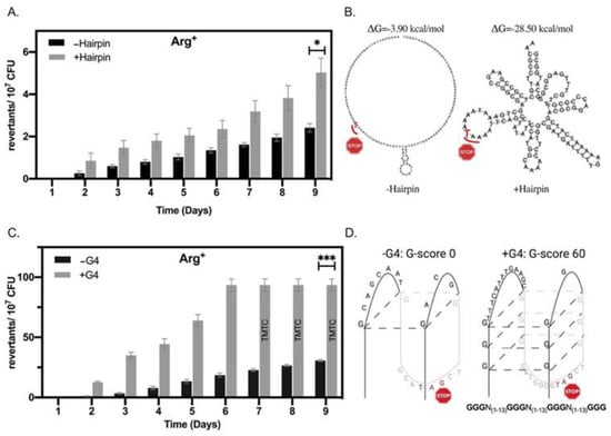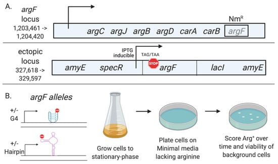 We investigated if non-B DNA-forming motifs, such as hairpins and G4 DNA sequences, contribute to stationary-phase mutagenesis in B. subtilis. First, we exploited the fact that this bacterium does not have a strong codon bias [50,51,52] to develop a system that altered endogenous non-B DNA sequences in the argF gene by introducing point mutations that increase or decrease their predicted stability. We then tested the effect of these changes on mutagenesis during growth and stationary phase.