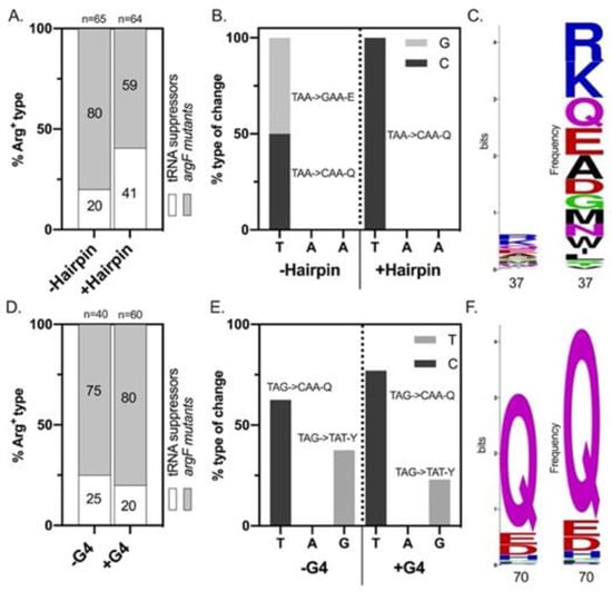 Arg+ revertant analysis. (A–C) +/−Hairpin results; (D–F) +/−G4 results. (A,D) The proportion of tRNA suppressors from Arg+ population sampled that arose from day 5–9. (B,E) argF sequencing results from Arg+ mutants that were determined not to be tRNA suppressors. (C,F) Protein alignment analysis of positions containing the nonsense codons 37 and 70.