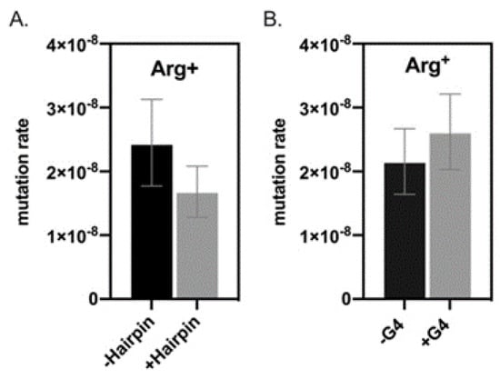Hairpin (A) and G4 DNA (B) forming motifs did not affect mutation rates in growing B. subtilis cells. Bars represent mutation rates using the MSS maximum likelihood method, and error bars are confidence limits (CL95).