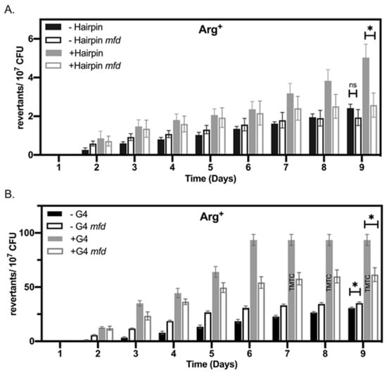 To identify factors governing the process by which non-B DNA-forming motifs promote the accumulation of mutations, we investigated if the transcription-repair coupling factor Mfd promoted mutations at non-B DNA sites. Mfd is a factor shown to promote transcription-dependent mutagenesis and is recruited to genomic regions containing non-B-DNA-forming motifs [17,28]. Disrupting mfd led to significant decreases in mutagenesis levels in the +hairpin and +G4 DNA strains. Subsequent analysis of the Arg+ population that arose in the absence of Mfd showed that the vast majority of revertants were tRNA suppressors in all strains; argF mutants were abolished in the absence of Mfd. This result is consistent with our previous studies in stationary-phase mutagenesis in B. subtilis [8,60]. This result further supports the promutagenic role of Mfd at transcribed regions and suggests that non-B DNA sites in bacteria influence Mfd-dependent mutagenesis.