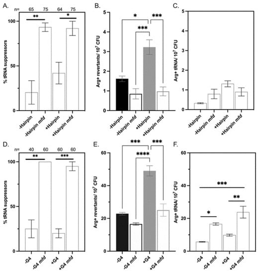 Subsequent analysis of the Arg+ mutants found that Mfd deficiency abolished mutations in argF as almost 100% of the mutants sampled were nonsense tRNA suppressors (Figure 6A,D). Thus, the spectrum of mutations changed drastically in the Mfd deficient strains. We estimated the total number of tRNA suppressors in this Arg+ population based on the sampling of mutants that arose at days 5–9 during the SPM trials. This analysis suggested that nonsense tRNA suppressors significantly increase in the +/−G4 lacking but not in the +/−hairpin strains in the Mfd− background (Figure 6C,F). The genetic changes that confer arginine prototrophy in argF (Figure 3E) suggest that mutagenesis of tyrosine (first position in the G/ATA anticodon) and glutamine (third position in the TTG anticodon) tRNA genes are increased in the absence of Mfd.