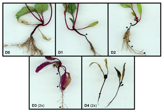 Classification of disease severity of beetroot seedlings based on lesions. Arrows indicate areas with dark lesions and thinning of the crown, stem, and root. Photos for D3 and D4 are shown at 2× magnification as compared to D0, D1, and D2. R. solani isolates were obtained from plants that had lesions, and they were identified as such by Sanger sequencing (data not shown). Photographs taken by the authors.