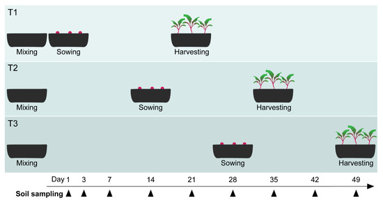 Experimental design of the ToS experiment. For T1, T2, and T3, the time gap in between soil organic amendments (day 0) and sowing is shown. The plant-growth period was the same for T1, T2, and T3 (3 weeks). Black arrows indicate the days when soil was sampled non-destructively from all pots. Additionally, at harvesting, root and shoot parts were collected. All pots were simultaneously incubated in a greenhouse.