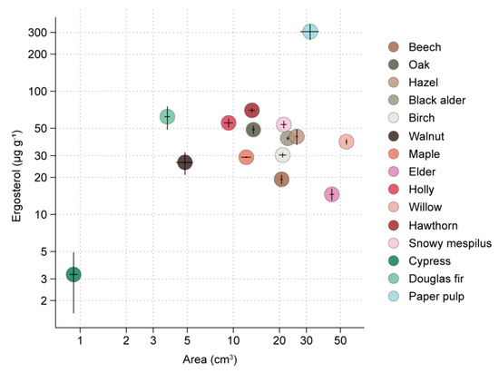 Performance of R. solani on 14 types of wood sawdust and paper pulp. The area of the substrates colonized by the mycelium of R. solani is shown on the x axis (mean ± SE, n = 5), whereas the y axis shows the ergosterol concentration of the substrate in the zone covered by Rhizoctonia hyphae, as a proxy for mycelial density (mean ± SE, n = 5). Both axes are log-scaled.