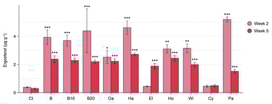 Fungal biomass stimulation in soil amended with sawdust of seven wood types, pre-decomposed beech sawdust, and paper pulp (WT experiment). Soil treatments are indicated as: Ct = control, B = beech sawdust, B10 = 10% pre-decomposed beech, B20 = 20% pre-decomposed beech, Oa = oak, Ha = hazel, El = elder, Ho = holly, Wi = willow, Cy = cypress, Pa = paper pulp. Ergosterol concentration is shown for amended and control pots (mean ± SE, n = 5) at the time of beetroot sowing (two weeks after amendment) and at harvesting of beetroot seedlings (five weeks after amendment). Significant differences between each treatment and the control (Dunnett’s test) are indicated as * 0.05 > p > 0.01; ** 0.01 > p > 0.001; *** p < 0.001.