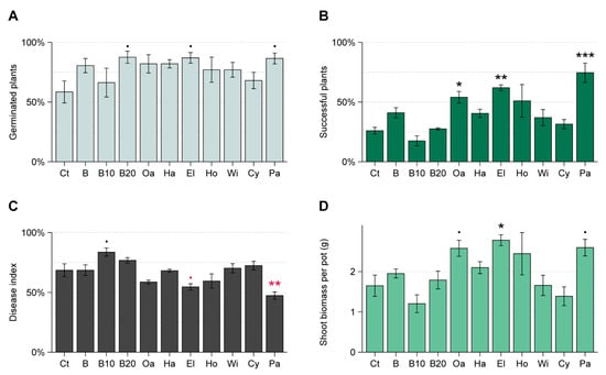 At the end of the three-week plant-growth period, the remaining plants in the pots were harvested. Roots and shoots were separated from each other, after classifying the disease symptoms (see Section 2.6). Shoots obtained from the same pot were pooled together and their biomass was measured after drying at 40 °C for 5 days.