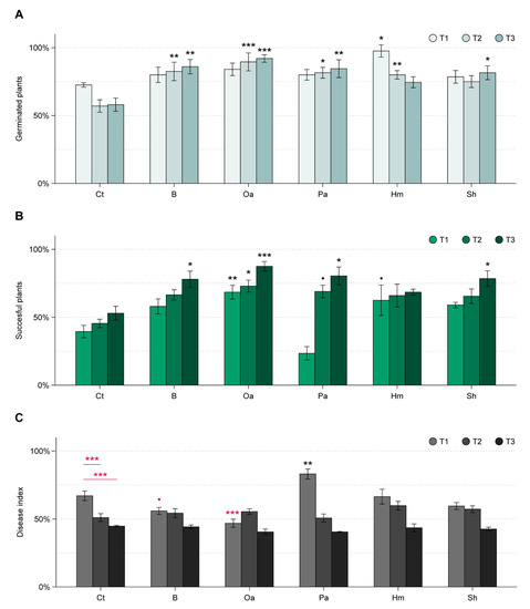Plants belonging to the D0, D1, and D2 classes, namely with no or minor disease symptoms, were indicated as “successful” for a simplified display of the results, whereas plants classified as D3 and D4 were not likely to survive, therefore they were indicated as “unsuccessful”. The rate of successful emerged seedlings was calculated for each pot in the same way as the germination rate.