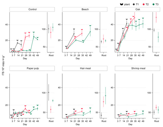Quantification of fungal (ITS2) copy numbers in soil amended with five organic materials and sown at three time points after amendment. Fungal copy number was determined in soil of both planted and unplanted pots 1, 3, 7, 14, 21, 28, 35, 42, and 49 days after amendment (x-axis) for control, oak, and paper pulp; whereas for beech, hair meal, and shrimp meal, data were collected for days 7, 21, 35, and 49 (x-axis). For all soil treatments, fungal copy numbers in the roots are shown as mean ± SE, n = 5. Plant symbols next to each data point indicate that soil samples were obtained from planted pots.
