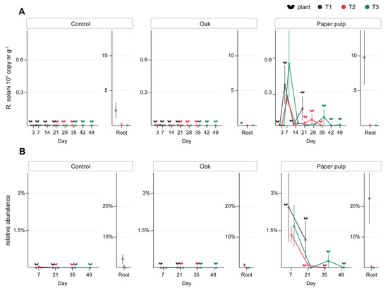 R. solani abundance in soil amended with oak sawdust and paper pulp and sown at three time points after amendment. (A) R. solani copy number was determined with qPCR in soil of both planted and unplanted pots at 1, 3, 7, 14, 21, 28, 35, 42, and 49 days after amendment (x-axis) and in roots (as mean ± SE, n = 5). (B) R. solani relative abundance was quantified by ITS amplicon sequencing in soil at 7, 21, 35, and 49 after amendment (x-axis) and in roots (as mean ± SE, n = 5). Plant symbols next to each data point indicate that soil samples were obtained from planted pots.