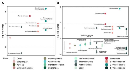 Effect of oak (A) and paper pulp (B) amendment as compared to control on bacterial families in soil sampled 7 days after amendment. Bacterial families significantly over- (log2 fold change > 0) and under-represented (log2 fold change < 0) were highlighted by differential abundance analyses (Wald test p < 0.01). Bacterial/fungal families are grouped by class along the x-axis; classes with relative abundance < 3% are indicated as “Other”.