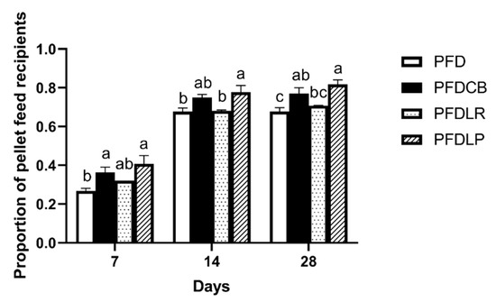 The POPFR of mandarin fish in different feeding groups (PFD, PFDCB, PFDLR and PFDLP) was tested on the 7th, 14th and 28th day of feeding. As shown in Figure 1, on the 28th day of feeding, the POPFR of mandarin fish in the PFDLP, PFDLR and PFDCB groups was higher than that in the PFD group, and the PFDLP and PFDCB groups reached a significant level of difference (p < 0.05). The highest POPFR of mandarin fish was recorded in PFDLP (81%) compared to PFD (68%) on the 28th day of feeding.