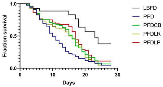 Kaplan Meyer’s (KM) survival analysis of mandarin fish in different feeding groups (LBFD, PFD, PFDCB, PFDLR and PFDLP) during 28 days of feeding. Abbreviations: LBFD, live bait fish feeding group; PFD, pellet-feed feeding group with probiotics free; PFDCB, pellet-feed feeding group with C. butyricum plus; PFDLR, pellet-feed feeding group with L. rhamnosus plus; PFDLP, pellet-feed feeding group with L. plantarum plus.