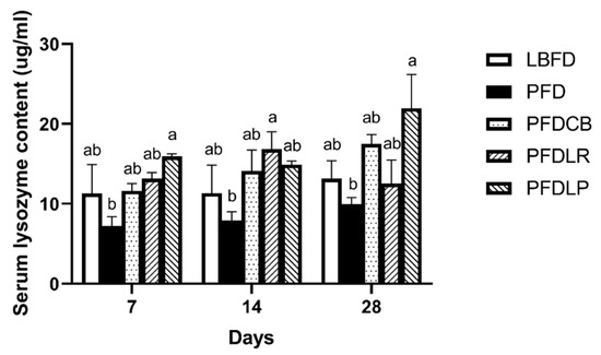 Mandarin fish in the PFD group had lower serum lysozyme content than that in the LBFD group at days 7, 14 and 28 of feeding (Figure 3). The effects of L. plantarum, L. rhamnosus and C. butyricum on serum lysozyme content are shown in Figure 3. Application of L. plantarum, L. rhamnosus and C. butyricum reduced the decrease of the serum lysozyme content of mandarin fish caused by the pellet feed diet (Figure 3). Compared with the PFD group, the content of serum lysozyme increased significantly on the 7th and 28th day in the PFDLP group and on the 14th day in the PFDLR group (p < 0.05) (Figure 3). The highest serum lysozyme content of mandarin fish was noticed in PFDLP after being fed for 28 days (Figure 3).