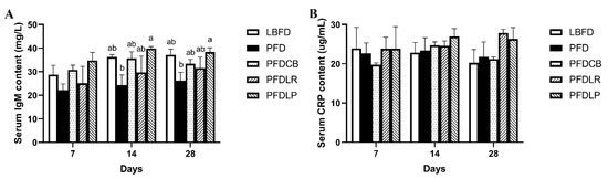 Serum content of IgM (A) and CRP (B) of mandarin fish in different feeding groups (LBFD, PFD, PFDCB, PFDLR and PFDLP) at day 7, 14 and 28 of feeding. Data are presented as mean ± SEM (n = 9). Abbreviations: IgM, immunoglobulin M; CRP, C-reactive protein; LBFD, live bait fish feeding group; PFD, pellet-feed feeding group with probiotics free; PFDCB, pellet-feed feeding group with C. butyricum plus; PFDLR, pellet-feed feeding group with L. rhamnosus plus; PFDLP, pellet-feed feeding group with L. plantarum plus. A value followed by a lowercase superscript (a–b) differs significantly from all other values not followed by the same lowercase superscript at the same time point based on ANOVA followed by the post hoc test (p < 0.05).