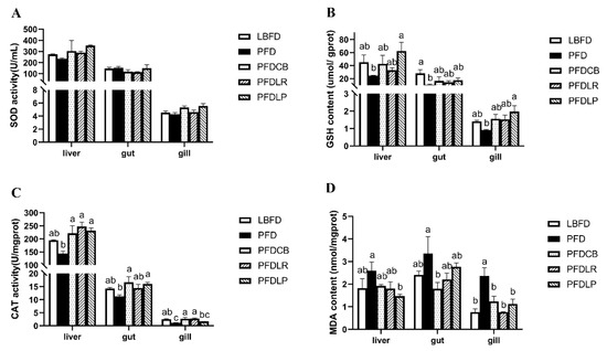 Activities of SOD (A), GSH (B) and CAT (C) and content of MDA (D) in the gut, liver and gills of mandarin fish in different feeding groups (LBFD, PFD, PFDCB, PFDLR and PFDLP) after being fed for 28 days. Data are presented as mean ± SEM (n = 9). Abbreviations: SOD, superoxide dismutase; GSH, glutathione; CAT, Catalase; MDA, malondialdehyde; LBFD, live bait fish feeding group; PFD, pellet-feed feeding group with probiotics free; PFDCB, pellet-feed feeding group with C. butyricum plus; PFDLR, pellet-feed feeding group with L. rhamnosus plus; PFDLP, pellet-feed feeding group with L. plantarum plus. A value followed by a lowercase superscript (a–c) differs significantly from all other values not followed by the same lowercase superscript at the same time point based on ANOVA followed by the post hoc test (p < 0.05).
