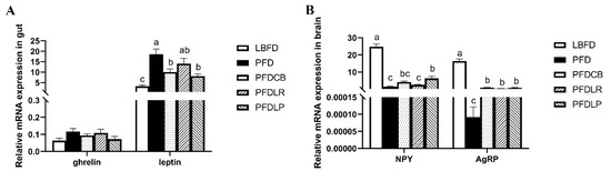 Relative mRNA expressions of appetite control genes in the gut (A) and brain (B) of mandarin fish in different feeding groups (LBFD, PFD, PFDCB, PFDLR and PFDLP) after being fed for 28 days. Data are presented as mean ± SEM (n = 9). Abbreviations: NPY, nerve peptide y; AgRP, agouti gene-related protein; LBFD, live bait fish feeding group; PFD, pellet-feed feeding group with probiotics free; PFDCB, pellet-feed feeding group with C. butyricum plus; PFDLR, pellet-feed feeding group with L. rhamnosus plus; PFDLP, pellet-feed feeding group with L. plantarum plus. Data are presented as mean ± SEM (n = 9). A value followed by a lowercase superscript (a–c) differs significantly from all other values not followed by the same lowercase superscript at the same time point based on ANOVA followed by the post hoc test (p < 0.05).