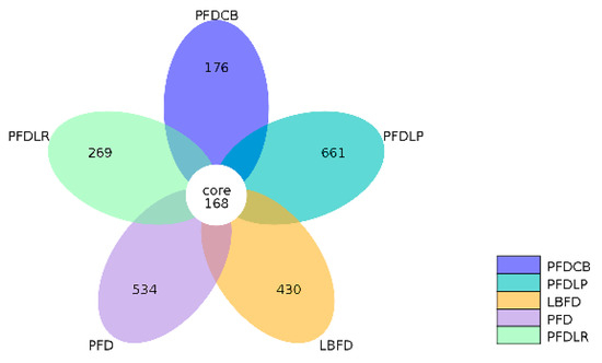 Venn diagram analysis depicting the numbers of shared and unique OTUs of mandarin fish intestinal microbial populations in different feeding groups (LBFD, PFD, PFDCB, PFDLR and PFDLP) after being fed for 28 days. Abbreviations: LBFD, live bait fish feeding group; PFD, pellet-feed feeding group with probiotics free; PFDCB, pellet-feed feeding group with C. butyricum plus; PFDLR, pellet-feed feeding group with L. rhamnosus plus; PFDLP, pellet-feed feeding group with L. plantarum plus.