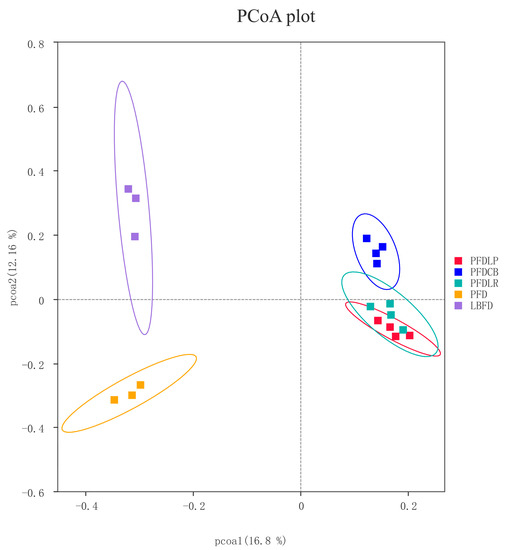 PCoA based on the binary jaccard distance of the intestinal bacterial communities of mandarin fish in different feeding groups (LBFD, PFD, PFDCB, PFDLR and PFDLP) after being fed for 28 days. Abbreviations: LBFD, live bait fish feeding group; PFD, pellet-feed feeding group with probiotics free; PFDCB, pellet-feed feeding group with C. butyricum plus; PFDLR, pellet-feed feeding group with L. rhamnosus plus; PFDLP, pellet-feed feeding group with L. plantarum plus.