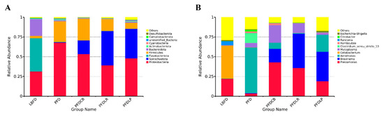 The abundance of composition at phylum (A) and genus (B) level in mandarin fish intestinal microbial populations in different feeding groups (LBFD, PFD, PFDCB, PFDLR and PFDLP) after being fed for 28 days. Abbreviations: LBFD, live bait fish feeding group; PFD, pellet-feed feeding group with probiotics free; PFDCB, pellet-feed feeding group with C. butyricum plus; PFDLR, pellet-feed feeding group with L. rhamnosus plus; PFDLP, pellet-feed feeding group with L. plantarum plus.