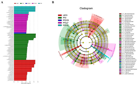 Intergroup variation in the relative abundance of the intestinal microbial communities. (A) Cladogram of LEfSe. (B) Bacterial taxa differentially displayed in the mandarin fish intestinal microbial populations in different feeding groups (LBFD, PFD, PFDCB, PFDLR and PFDLP) after being fed for 28 days were identified via LEfSe using an LDA score threshold of >3. Abbreviations: LBFD, live bait fish feeding group; PFD, pellet-feed feeding group with probiotics free; PFDCB, pellet-feed feeding group with C. butyricum plus; PFDLR, pellet-feed feeding group with L. rhamnosus plus; PFDLP, pellet-feed feeding group with L. plantarum plus.
