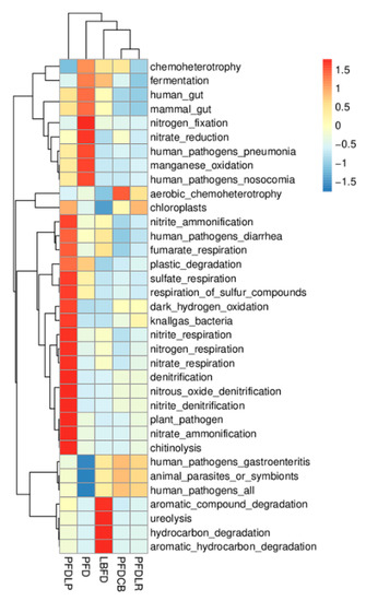 Heatmap showing the relative abundances of KEGG ortholog groups of mandarin fish intestinal microbial populations in different feeding groups (LBFD, PFD, PFDCB, PFDLR and PFDLP) after being fed for 28 days. The heatmap was made based on Tax4Fun functional annotations, and the color intensity indicates the abundance information. Abbreviations: LBFD, live bait fish feeding group; PFD, pellet-feed feeding group with probiotics free; PFDCB, pellet-feed feeding group with C. butyricum plus; PFDLR, pellet-feed feeding group with L. rhamnosus plus; PFDLP, pellet-feed feeding group with L. plantarum plus.