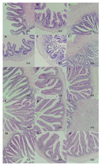 Photomicrographs showing histological sections of the intestinal tract of mandarin fish in different feeding groups (LBFD, PFD, PFDCB, PFDLR and PFDLP) after being fed for 28 days. (H.E. staining; scale bar: 50 μm; magnification ×200). (A–C) Foregut, midgut and hindgut of mandarin fish in LBFD group. (D–F) Foregut, midgut and hindgut of mandarin fish in PFD group. (G–I) Foregut, midgut and hindgut of mandarin fish in PFDCB group. (J–L) Foregut, midgut and hindgut of mandarin fish in PFDLR group. (M–O) Foregut, midgut and hindgut of mandarin fish in PFDLP group. Abbreviations: H.E., hematoxylin and eosin staining; LBFD, live bait fish feeding group; PFD, pellet-feed feeding group with probiotics free; PFDCB, pellet-feed feeding group with C. butyricum plus; PFDLR, pellet-feed feeding group with L. rhamnosus plus; PFDLP, pellet-feed feeding group with L. plantarum plus.