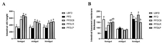 Histological changes of the intestinal tract were observed in different feeding groups (LBFD, PFD, PFDCB, PFDLR and PFDLP) after being fed for 28 days (Figure 12). By comparing LBFD, PFD, PFDCB, PFDLR and PFDLP, the result showed that C. butyricum, L. rhamnosus and L. plantarum could significantly increase the villi height of the foregut, midgut and hindgut of mandarin fish fed with pellet feed (p < 0.05; Figure 13A) and significantly reverse the decrease in the thickness of foregut basement membrane caused by pellet-feed feeding (p < 0.05; Figure 13B).