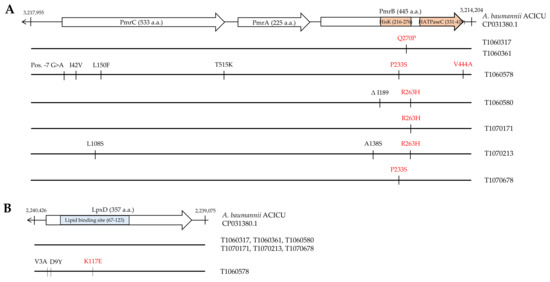 The PmrAB two-component system mediates colistin resistance in many Gram-negative bacteria including A. baumannii [51]. It regulates several genes encoding LPS modifying enzymes including pmrC, naxD, and eptA. Non-synonymous mutations in pmrAB may dysregulate its downstream genes. Compared to the reference strain, the seven isolates harbored a number of non-synonymous mutations in the histidine kinase domain of pmrB (Figure 1A). Three of the resulted amino acid substitutions (P233S, R263H, and Q270P) in PmrB are known to confer colistin resistance [17,52,53]. Two isolates, T1060578 and T1070213, harbored additional new substitutions outside the histidine kinase domain of PmrB, the effects of which are not known. No mutation was found in pmrA in the seven isolates. New mutations in pmrC were found in two isolates, where T1060578 (ST136, Pasteur) harbored three non-synonymous mutations in pmrC and one mutation in its promoter region. An L108S substitution in PmrC was found in T1070213. Pre-existing mutations in the population or mutations generated from antibiotic-induced stress responses are known to be selected under antibiotic treatments [54,55]. Indeed, our five patients, from whom the seven isolates were collected, had previously received colistin treatment.