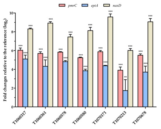 The expression levels of pmrC, eptA, and naxD were determined using reverse transcriptase quantitative PCR. Bacterial cultures in exponential phase (OD600 of 0.5~0.7) were harvested and treated with RNAlaterTM solution (Thermo Fisher Scientific, Carlsbad, CA, USA) for one hour at room temperature. Total RNA was extracted using PureLinkTM RNA Mini Kit (Thermo Fisher Scientific, Carlsbad, CA, USA). DNA was eliminated by DNase I (Lucigen Corporation, Middleton, WI, USA) treatment. RNA was further purified using RNA Clean and ConcentratorTM-5 (Zymo Research, Irvine, CA, USA). Concentration of total RNA was measured using NanoDrop® ND-1000 spectrophotometer (Thermo Fisher Scientific, Waltham, MA, USA) and integrity of RNA was evaluated using agarose gel electrophoresis. Complementary DNA was synthesized using High-capacity cDNA Reverse Transcription Kits (Applied Biosystems, Waltham, MA, USA). Three targeted genes (eptA, naxD, and pmrC) and the reference gene (rpoB) were quantified using SensiFASTTM SYBR® Hi-ROX Kit (Meridian Bioscience, Cincinnati, OH, USA) with respective primer pairs (listed in Table S1) in Applied Biosystems 7300 Real-Time PCR System (Thermo Fisher Scientific, Waltham, MA, USA). Relative expression levels were determined using the 2-∆∆Ct method [45]. A. baumannii ATCC 19606 was chosen as the reference. Statistical significances between the CCR-AB isolates and the reference were calculated using one-way ANOVA. Statistical analyses and graphs were produced using GraphPad Prism 5.