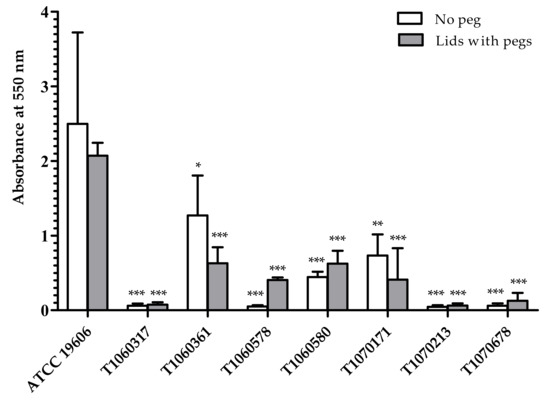 Biofilm formation abilities of the CCR-AB isolates. Individual bacterial suspension was cultured overnight in conventional 96-well plates (‘No peg’; open bars) or in 96-wells with lid pegs (filled bar). Biofilms were measured by crystal violet staining. The ordinate represents measured absorbance at 550 nm. The error bars indicate standard errors from three replicate determinations. Statistical analysis was calculated using one-way ANOVA with Dunnett’s test for comparison to the reference, ATCC 19606. Numbers of asterisks indicate significant difference in different levels with p ≤ 0.001 (***), 0.001 < p ≤ 0.01 (**), and 0.01 < p ≤ 0.05 (*).