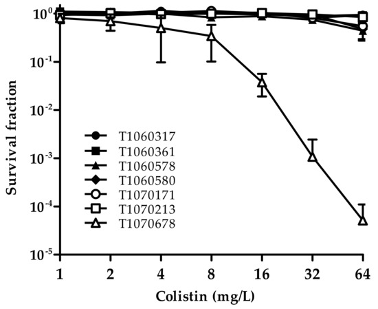 A 33% prevalence of colistin heteroresistance in Acinetobacter spp. based on a meta-analysis has been reported [58]. In the seven CCR-AB isolates, six displayed stable resistance to colistin with a higher than 40% survival rate at the highest colistin concentration tested (64 mg/L). The other isolate, T1070678, displayed heteroresistance with 3.8 × 10−2 survival at 16 mg/L of colistin (Figure 5). T1070678 contains a P233S substitution in PmrB, which is known to be associated with stable resistance [59]. No reported mutations in pmrA or pmrB are known to be involved in heteroresistance. It is possible that colistin heteroresistance in T1070678 may be attributed to elevated efflux pumps, as has been previously reported [60].