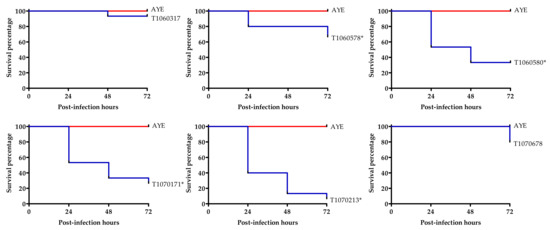 Survival curve of wax moth larvae after injection of the CCR-AB isolates. Fifteen larvae at the late larva stage were injected with 105 CFU of each isolate culture. Survival of the injected larvae after 24, 48, and 72 h were scored. The survival curves were plotted using Kaplan–Meier analysis. PBS solution injection (as a negative control) exhibited no lethality during the observation period. A. baumannii AYE was used as a reference for comparison. Representative results from three independent replicates are shown. The asterisks (*) indicate the significant difference (p < 0.01) between the reference and tested isolate.