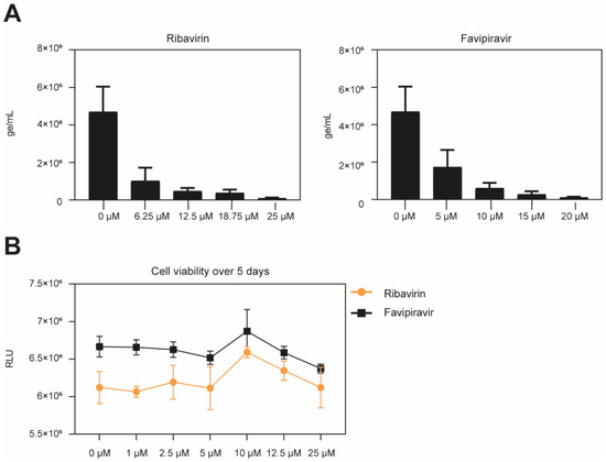 Favipiravir (T-705) was from Toyama Chemical Co., Ltd. (Tokyo, Japan), diluted in DMSO at a concentration stock of 100 mM. For infection studies, favipiravir was tested at 5, 10, 15, 20 µM. Ribavirin was obtained from Sigma (Buchs, Switzerland), diluted at 10 mM in H2O and tested at 6.25, 12.5, 18.75, 25 µM. Drug interaction was tested in a 5 × 5 matrix in all possible combinations.