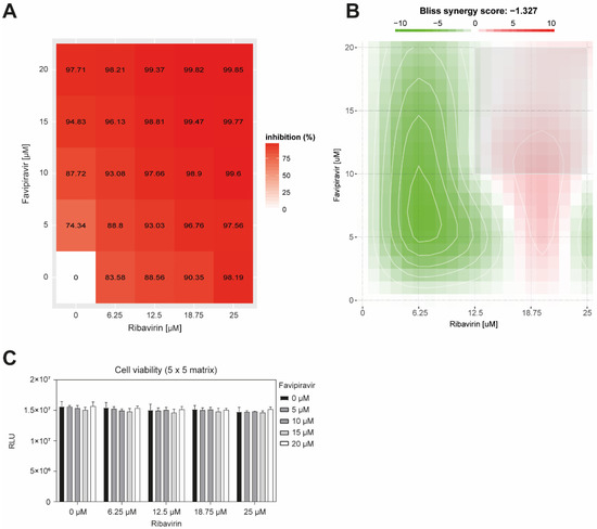 To evaluate antagonistic or synergistic effects, we used the Bliss independence model, which states that two drugs have an independent effect, and their combination is calculated based on the probability of independent events [26,27,28]. As ribavirin and favipiravir have been demonstrated to block infection via distinct modes of action, they are considered to act independently [23]. All combinations demonstrated a strong antiviral efficacy (Figure 2B), and the drug combinations demonstrated no cell toxicity (Figure 2C). The highest antiviral activity showing a decrease of HTNV particles from 5.8 × 106 to 6.3 × 104 genome/mL and corresponding to >99% of inhibition, is observed with the drug combination 12 μM favipiravir/18.75 μM ribavirin. The Bliss synergy score of −1.327 argues for an additive effect.