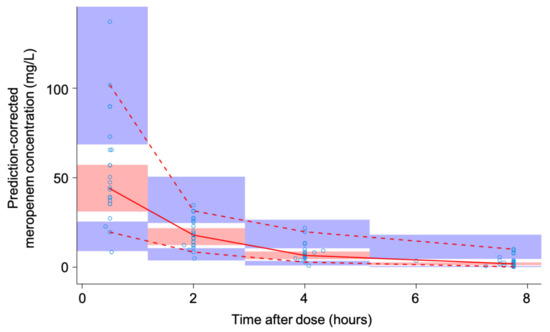 Prediction-corrected visual predictive check of the final population pharmacokinetic model. Blue open circles represent the observed free meropenem plasma concentrations. The solid red line is the median of the observed data. The dashed red lines are the 2.5th and 97.5th percentile of the observed data. The red and blue shaded areas indicate the 95% prediction intervals of the median and the 2.5th and 97.5th percentile, respectively, of the simulated data (n = 1000).