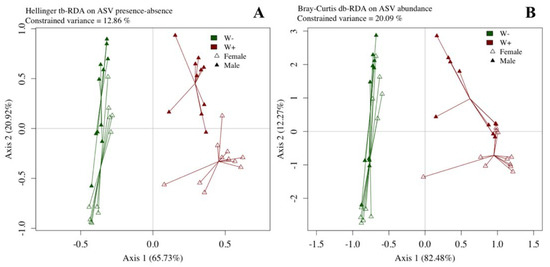 4.3. Wolbachia Influence Male and Female Bacterial Communities Equally