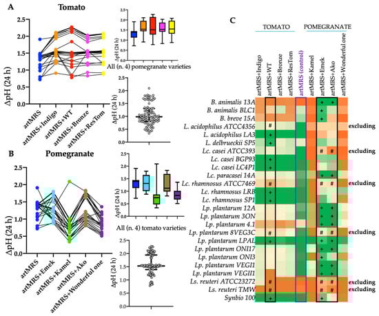 Acidification rate (ΔpH) after 24 h of probiotic growth at 37 °C in artisanal MRS with 2 g/L of glucose (artMRS) used alone, as a control, or supplemented with different antioxidant matrices (5 g/L). (A) Evaluation of lyophilized tomato extract from four different varieties, specifically Indigo (artMRS + Indigo), wild type (artMRS + WT), Bronze (artMRS + Bronze), and ResTom (artMRS + ResTom). (B) Evaluation of pomegranate juices of four different varieties, specifically Kamel (artMRS + Kamel), Emek (artMRS + Emek), Ako (artMRS + Ako), and Wonderful one (artMRS + Wonderful one). (C) Heatmap of the ΔpH values found in media supplemented with lyophilized tomato extracts and pomegranate juices after 24 h of probiotics growth; values range from dark orange (lower ΔpH values, <25th percentile) to dark green (higher ΔpH values, >75th percentile), with light yellow corresponding to intermediate ΔpH values (50th percentile). Data are presented as the average of at least one biological triplicate ± standard deviation (SD). Inside the heatmap, # indicates that the tested condition determined the exclusion of the probiotics, whereas + indicates that the tested condition determined the selection of the probiotics.