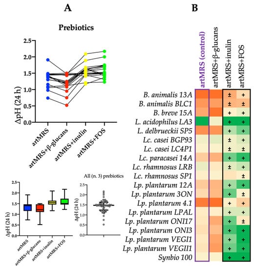 The same workflow was also adopted for prebiotics, specifically β-glucans, inulin, and fructo-oligosaccharides (FOS). Compared with the control (artMRS), strains grown on artMRS with inulin or FOS showed similar or higher ΔpH values (Figure 2A).