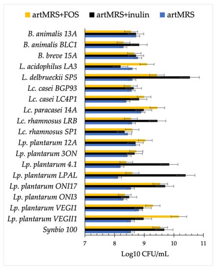 Viable cell count (log CFU/mL) of probiotics after 24 h of growth at 37 °C in artisanal MRS (2 g/L of glucose (artMRS)) with the addition of fructo-oligosaccharides (artMRS + FOS, 5 g/L) or inulin (artMRS + inulin, 5 g/L). Data are presented as the average of one biological triplicate ± SD.