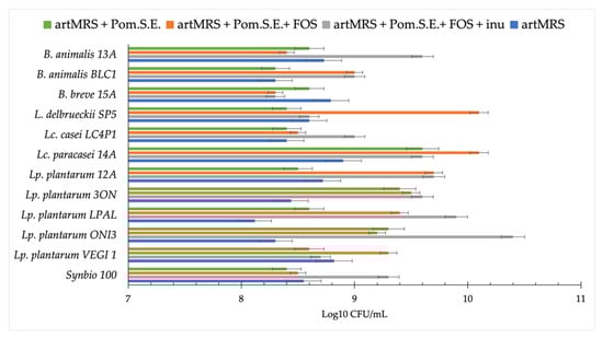 Probiotics viable cell count (log CFU/mL) after 24 h of growth at 37 °C in artisanal MRS (2 g/L of glucose; artMRS) used alone (as a control) or supplemented with pomegranate seed extract (Pom.S.E.; 5 g/L), or Pom.S.E. + fructo-oligosaccharides (FOS) (both 5 g/L), or Pom.S.E. (5 g/L) + FOS (2.5 g/L) + inulin (2.5 g/L). Data are presented as the average of one biological triplicate ± SD.