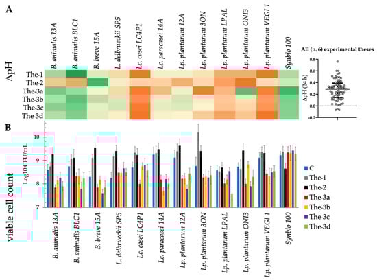 In addition, HC fecal medium with only glucose added was used as the control. Each fecal medium was inoculated with the selected probiotics. After 24 h of incubation, most of the probiotics acidified the fecal media, showing a ΔpH ranging from 0.2 to 0.4 (Figure 5A). B. animalis BLC1 showed the highest ΔpH (value: 0.78) when inoculated in The-1, whereas B. breve 15A showed the highest ΔpH (value: 0.60) in The-2. Probably due to the production of basic compounds (e.g., NH3), some strains showed a pH increase, specifically Lc. casei LC4P1 grown The-1 and The-3d (−0.18 and −0.19, respectively) and Lp. plantarum ONI3 grown in The-2 (−0.15).