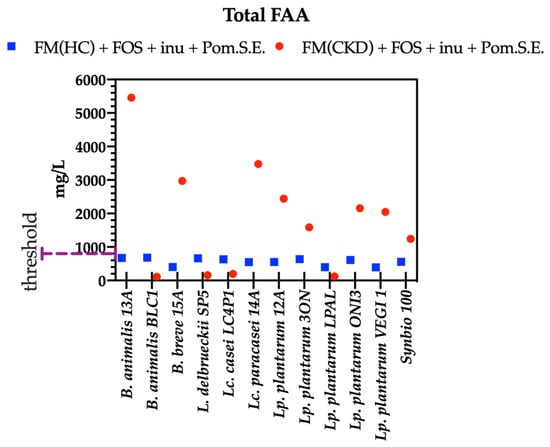 Concentrations of total free amino acids (FAAs, mg/L) after 24 h of probiotics growth in fecal media (FM) obtained from pooled feces of healthy subjects (HC) or chronic kidney disease patients (CKD) + 2 g/L of glucose + FOS (2.5 g/L) + inulin (inu; 2.5 g/L) + pomegranate seed extract (Pom.S.E.; 5 g/L). Data are reported as the average of one technical triplicate.