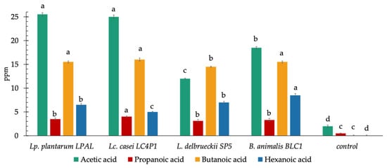 Gas chromatography-mass spectrometry (GC-MS) analysis was conducted to evaluate the ability of the four selected probiotic strains to produce short-chain fatty acids (SCFAs). FOS and inulin (each 2.5 g/L) were added to fecal extracts from HC to constitute a HC fecal medium. B. animalis BLC1, L. delbrueckii SP5, Lc. casei LC4P1, and Lp. plantarum LPAL were inoculated at a cell density of 7 log CFU/mL. After 24 h at 37 °C, Lp. plantarum LPAL and Lc. casei LC4P1 were able to produce the highest amounts (ppm equivalents) of acetic acid (Figure 8). Moreover, Lc. casei LC4P1 produced higher amounts of both butanoic and propanoic acids than Lp. plantarum LPAL. The highest concentration of hexanoic acid was found in the HC fecal media inoculated with B. animalis BLC1. Therefore, B. animalis BLC1 and Lc. casei LC4P1 were selected as the best SCFA-producing probiotics.
