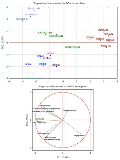 The results of cell densities of the main gut cultivable bacterial groups were elaborated using principal components analysis (PCA). At T0, CKD samples were mainly characterized by high Enterobacteriaceae and staphylococci and low lactic acid bacteria (LABs) and lactobacilli (Figure 9). The opposite was found in HC samples at T0. The addition of NatuREN G determined after 24 h showed a shift in CKD samples (CKD-NG-t24) toward the side of the PCA factor-plan wherein all the HC samples had fallen. This was mainly determined by the increase in the viable cell count of both LABs and lactobacilli. Differently, 24 h after adding NatuREN G to HC samples (HC-NG-t24), an increase in viable cell count of the groups Bacteroides–Prevotella–Porphyromonas, Pseudomonas–Aeromonas, and particularly of the bifidobacterial taxa, was found. This increase was related to decreases in total bacterial, total anaerobes, and Enterococcus. Few differences in the HC and CKD samples where NatuREN G had not been added were found compared with T0.
