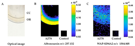 A unique signal at m/z 257.132 was exclusively present in the OR region (Figure 1B). Based on accurate mass measurements, this signal was tentatively annotated as the diketopiperazine albonoursin. The remaining m/z values were shared by OR and CC regions and were tentatively assigned to different antibiotic classes (Table 1). In particular, signals at m/z 1419.866 and 1447.770 were tentatively assigned to mathemycin A and langkolide belonging to the class of macrolactone antibiotics, respectively. In addition, the latter signal (m/z 1447.770) could potentially be matched with the cyclic depsipeptide SNA-60-367-14. Furthermore, a signal at m/z 748.433 was putatively matching with the macrolide antibiotic clarithromycin. The signals at m/z 1584.805 (Figure 1C), 1600.810 and 1598.827, 1614.838 might match with the cyclic lipodepsipeptides WAP-8294A2 and WAP-8294A4 or WAP-8294Ax13, respectively. The remaining signals were putatively matching with the cyclic depsipeptides CB-182333 and CB-182348-49.
