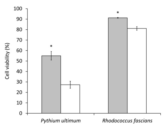 Relative P. ultimum and R. fascians cell viability was calculated according to the following formula: