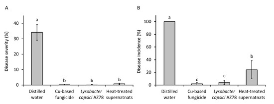 Control of Plasmopara viticola infection on grapevine leaf disks by the application of heat-treated Lysobacter capsici AZ78 (AZ78) cell-free supernatants. (A) Disease severity (% of leaf area covered by sporulating lesions), (B) Disease incidence (% of leaf disks showing symptoms). Twenty-four hours before the inoculum of Pl. viticola, grapevine leaf disks were treated with distilled water; copper-based fungicide; AZ78 cells; and heat-treated AZ78 cell-free supernatants. For each treatment, five Petri dishes containing five leaf disks were used. Data originating from two independent experiments were pooled and statistically analysed. Mean values ± standard deviations are reported for each treatment. Columns with the same letters do not differ significantly according to Tukey’s test (α = 0.01).